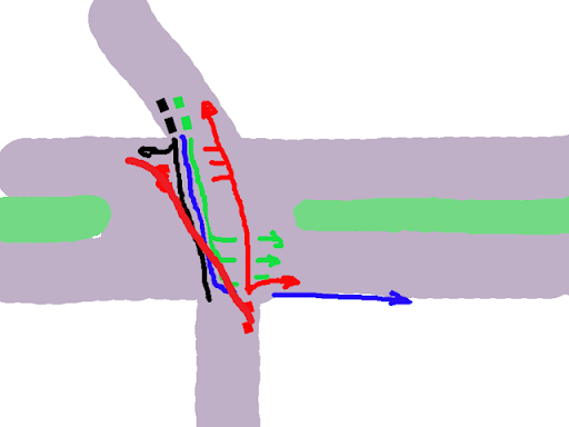 опять же траектория зеленого может быть и по диагонали если он хочет успеть проскочить перед красными но она неправильная и может закончится плачевно если красные окажутся быстрее)) но опять же судя по вашему первому посту вы оказались где то еще левее чем он в то время как правильная траектория - синяя