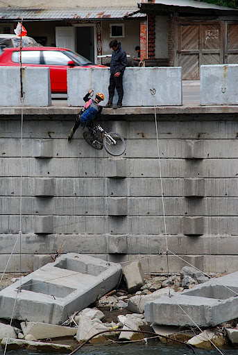 Bike1 Протяженность 41 км, набор высоты 1100 м.- основная часть шла по отличному асфальту вдоль речки вверх, уклон не мешал, и хорошее покрытие позволяло держать отличный темп. За поселком Говерла кончился асфальт, началься офф, началься набор высоты. На плотине ожидал технический этап. Сказали что троллей. Троллей - скоростоной спуск на вревке. Оказался жумаринг. Жумаринг - подъем по веревке. Наклон веревке к концу был настолько суров, что от натуги началась кружится голова. Представьте себе что вы должны подтянутся 30 раз, тогда как ваш рекорд всего 10. Прошли, вернулись к велам и подъему. Начался серпантин. Решили сойти с велосипедов и пойти пешком, чтобы съэкономить силы впоследствии. Тут нас обогнали многие команды. На тропе стояли таблички высот, на 1400 начался снег, а следовательно поносинг. Поносинг - переноска велосипеда, чаще всего на себе.